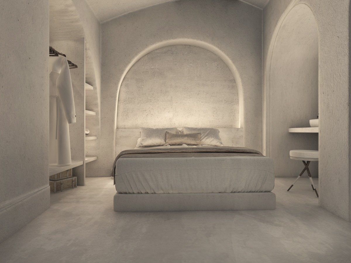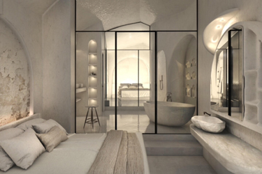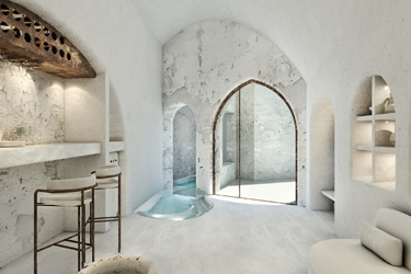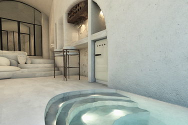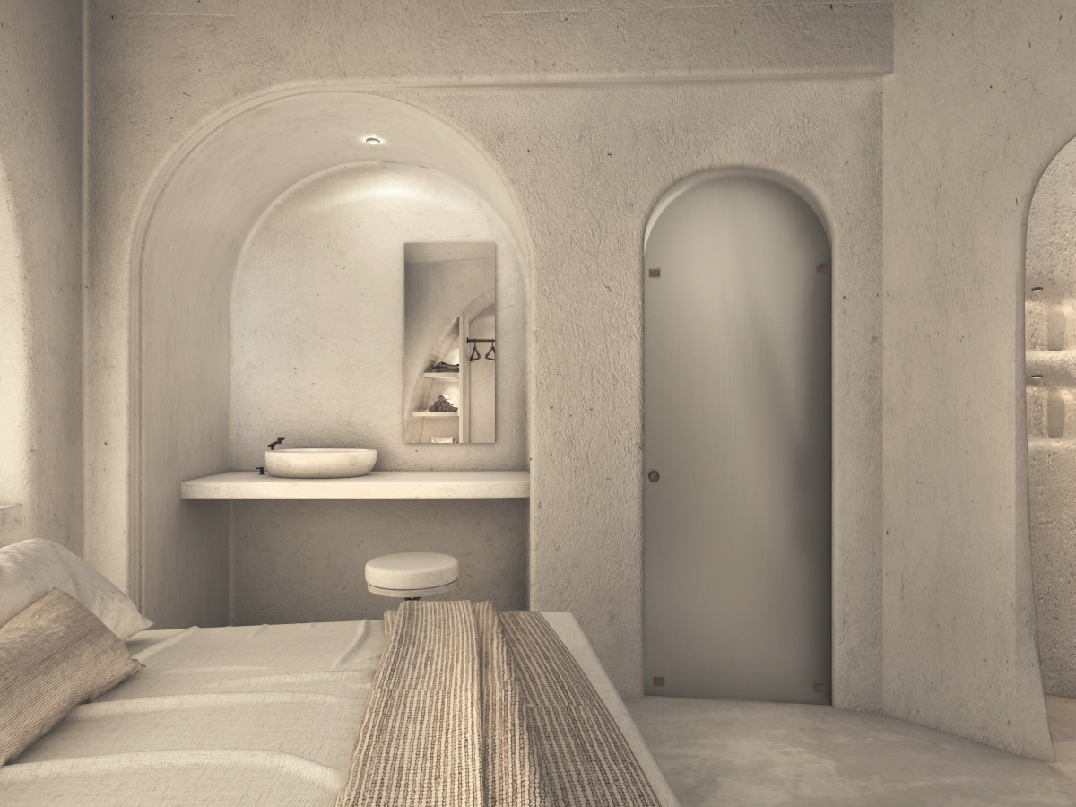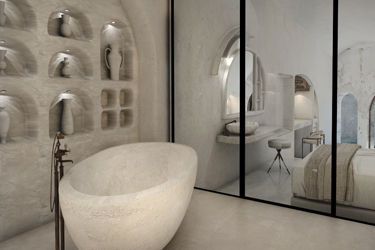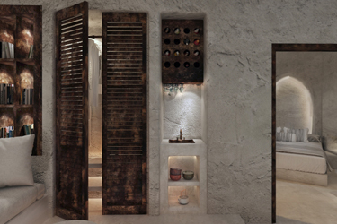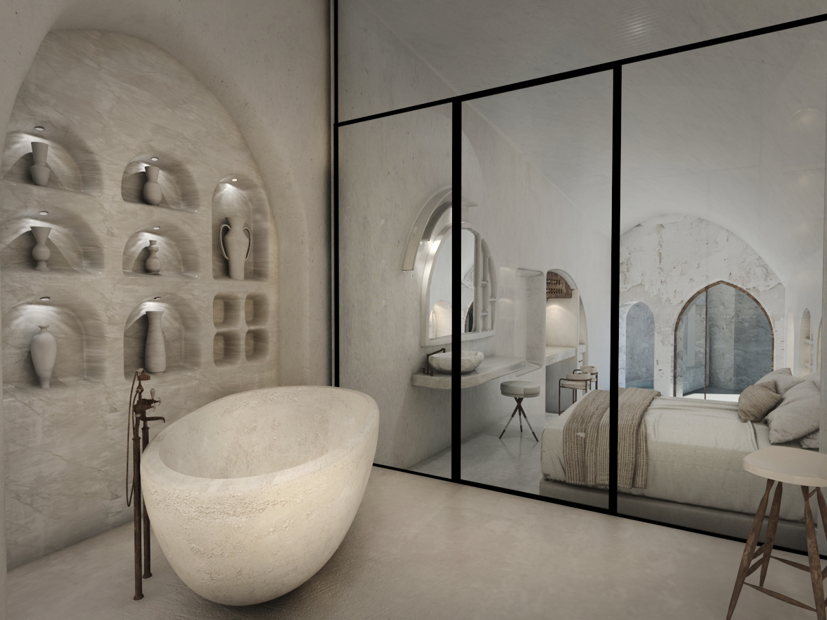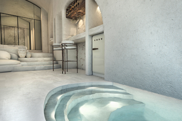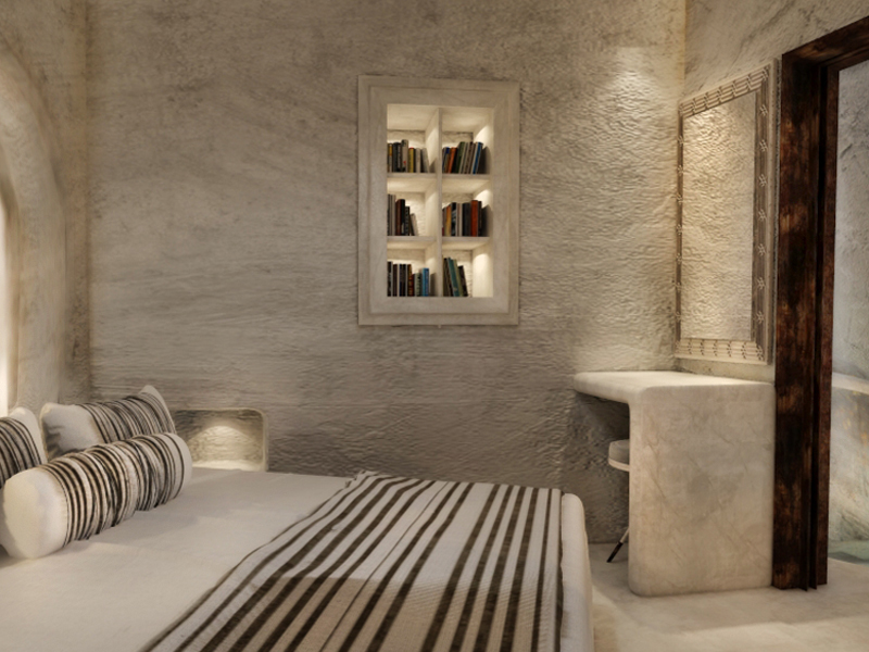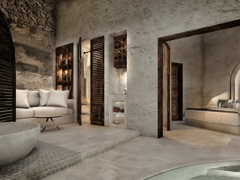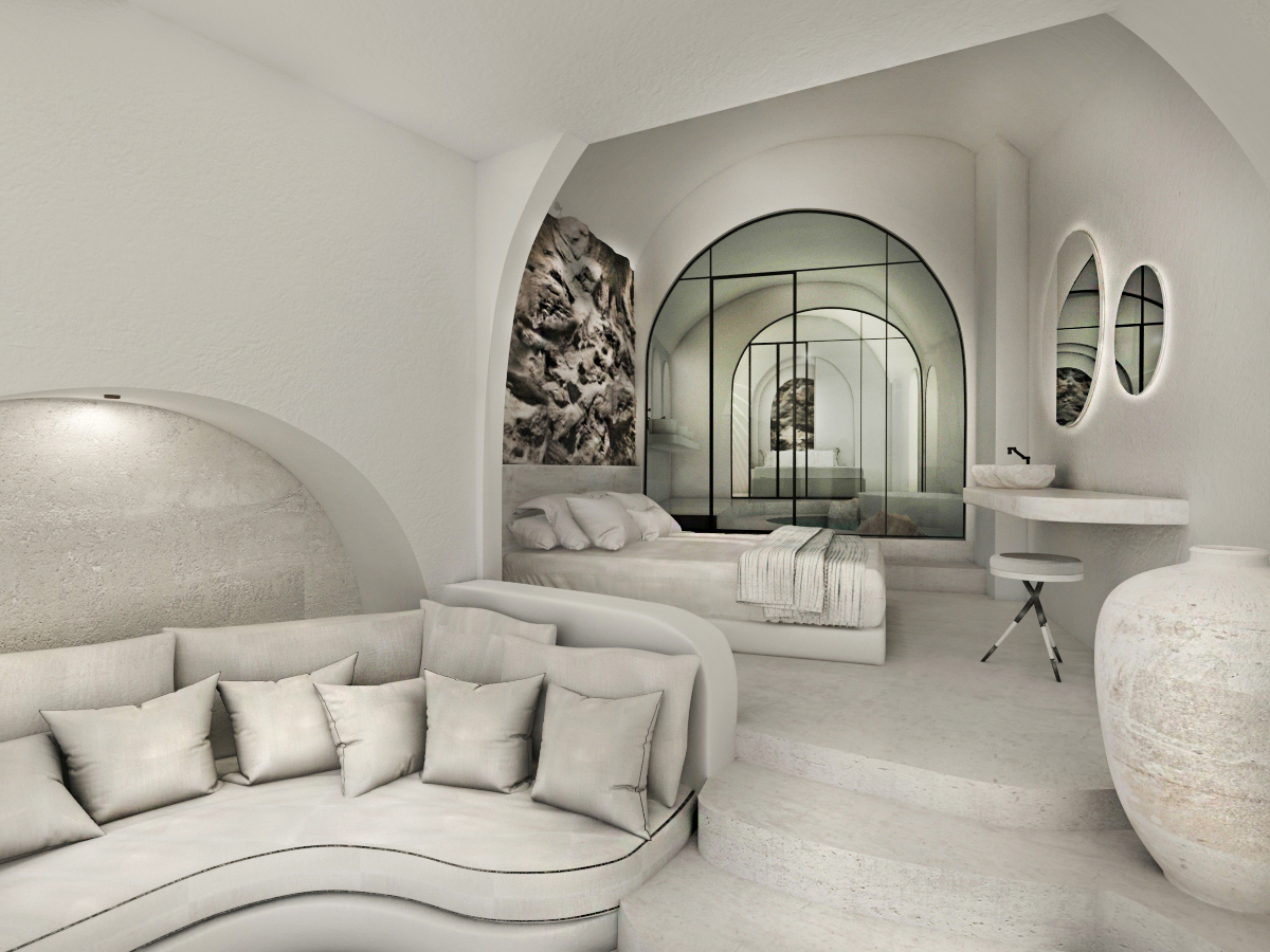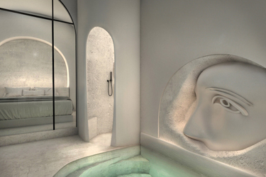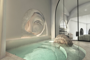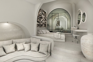 The guest opens the door of his suite and enters another world, a respite from ordinary life. Antiquity, though principal, transcends its era and becomes inextricably intertwined with a contemporary design, dramatic features and the art deco element that triumphs in this suite: Arches housing glass doors, the opulence of the coach, the rock above the bed as an organic texture of the suite. The jacuzzi pool with its many twists and turns that “hugs” the water, the light that is highlighted as the protagonist of an Impressionist painting, the aesthetics of tranquility that are periodically disturbed by the iron textures on the perimeter of the door leaf. The strict stylistic patterns in the alcoves of the room, and the simple, clear-cut geometry of the walls. The supremacy of the water adds a sense of exoticism that every paradise loves to evoke. A room and a word intricately linked to it, which enfolds what dreams do not say. One big word: “Aegean.”