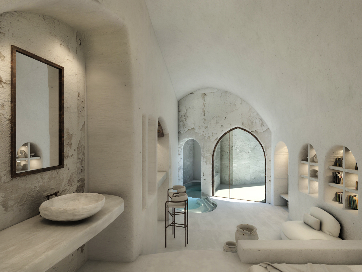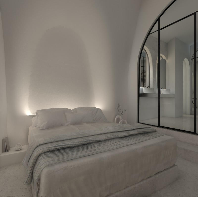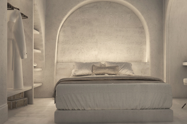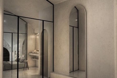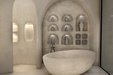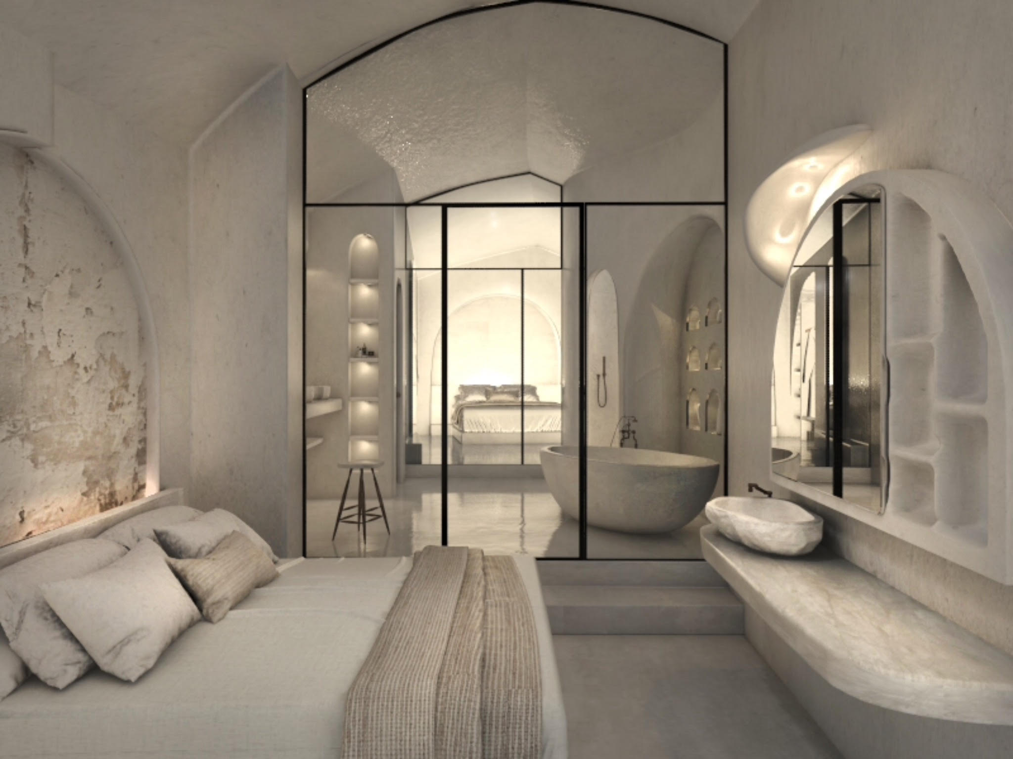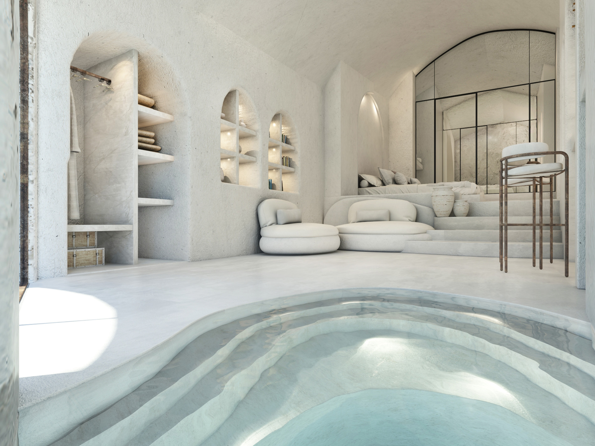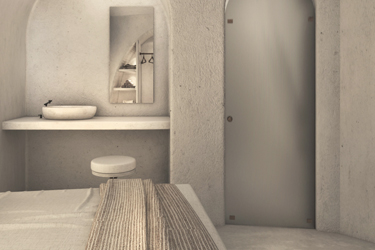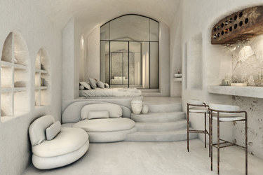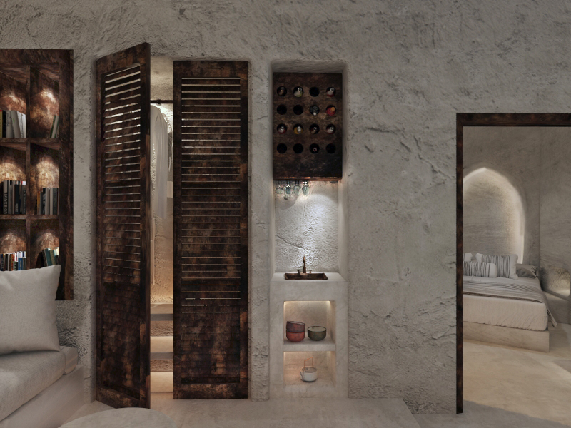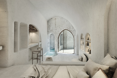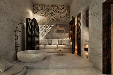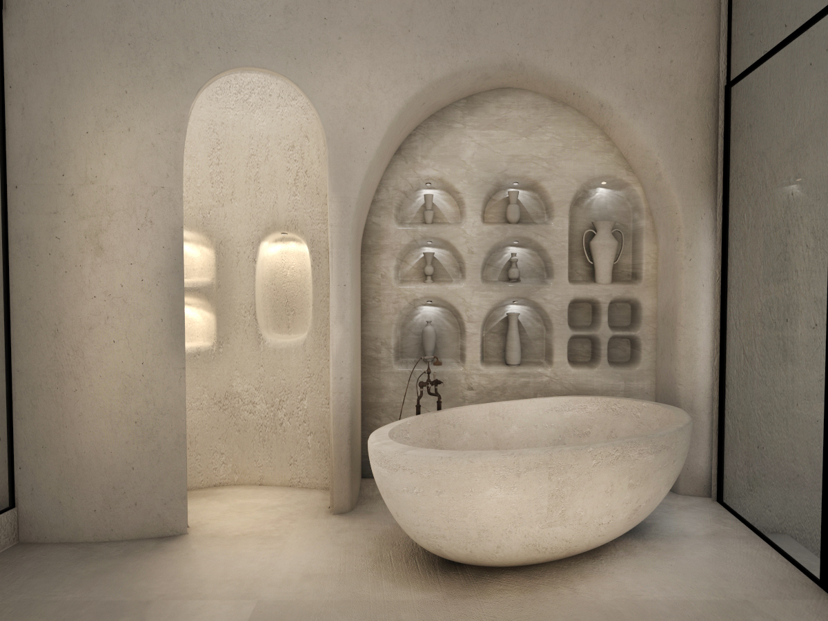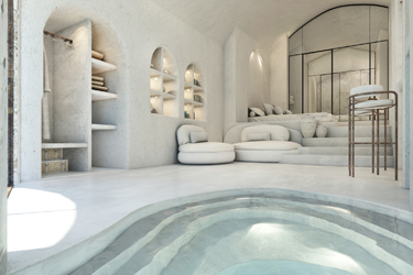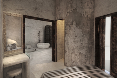 The guest opens the door of his suite and enters another world, a respite from ordinary life. Antiquity, though principal, transcends its era and becomes inextricably intertwined with a contemporary design, dramatic features and the art deco element that triumphs in this suite: Arches housing glass doors, the opulence of the coach, the rock above the bed as an organic texture of the suite. The jacuzzi pool with its many twists and turns that “hugs” the water, the light that is highlighted as the protagonist of an Impressionist painting, the aesthetics of tranquility that are periodically disturbed by the iron textures on the perimeter of the door leaf. The strict stylistic patterns in the alcoves of the room, and the simple, clear-cut geometry of the walls. The supremacy of the water adds a sense of exoticism that every paradise loves to evoke. A room and a word intricately linked to it, which enfolds what dreams do not say. One big word: “Aegean.”