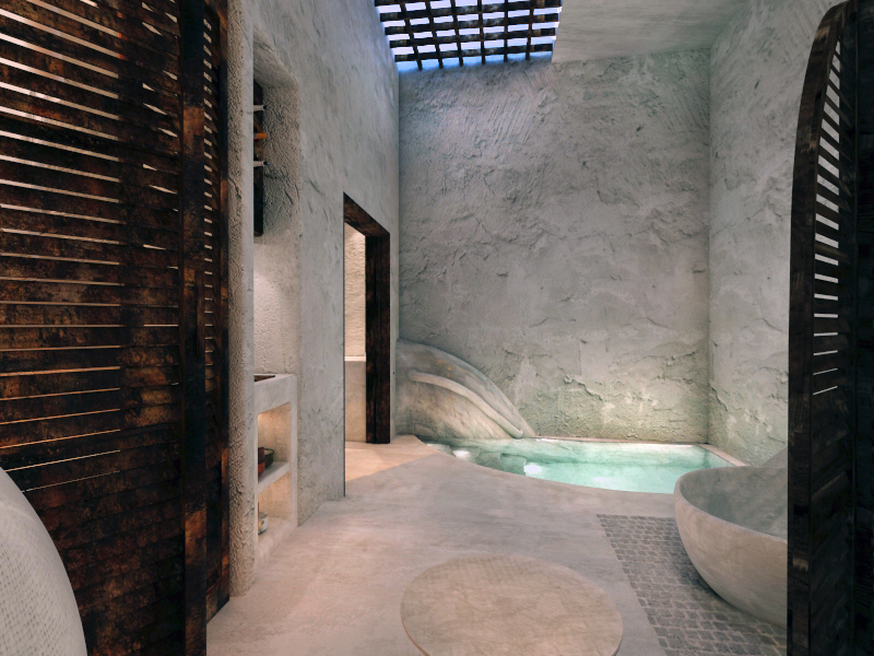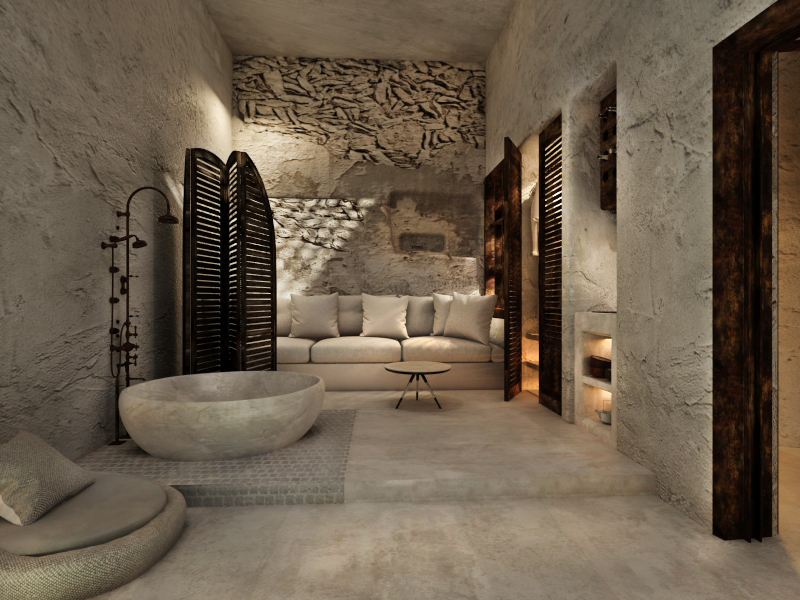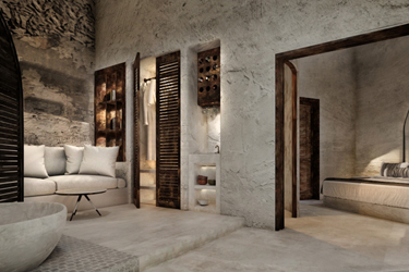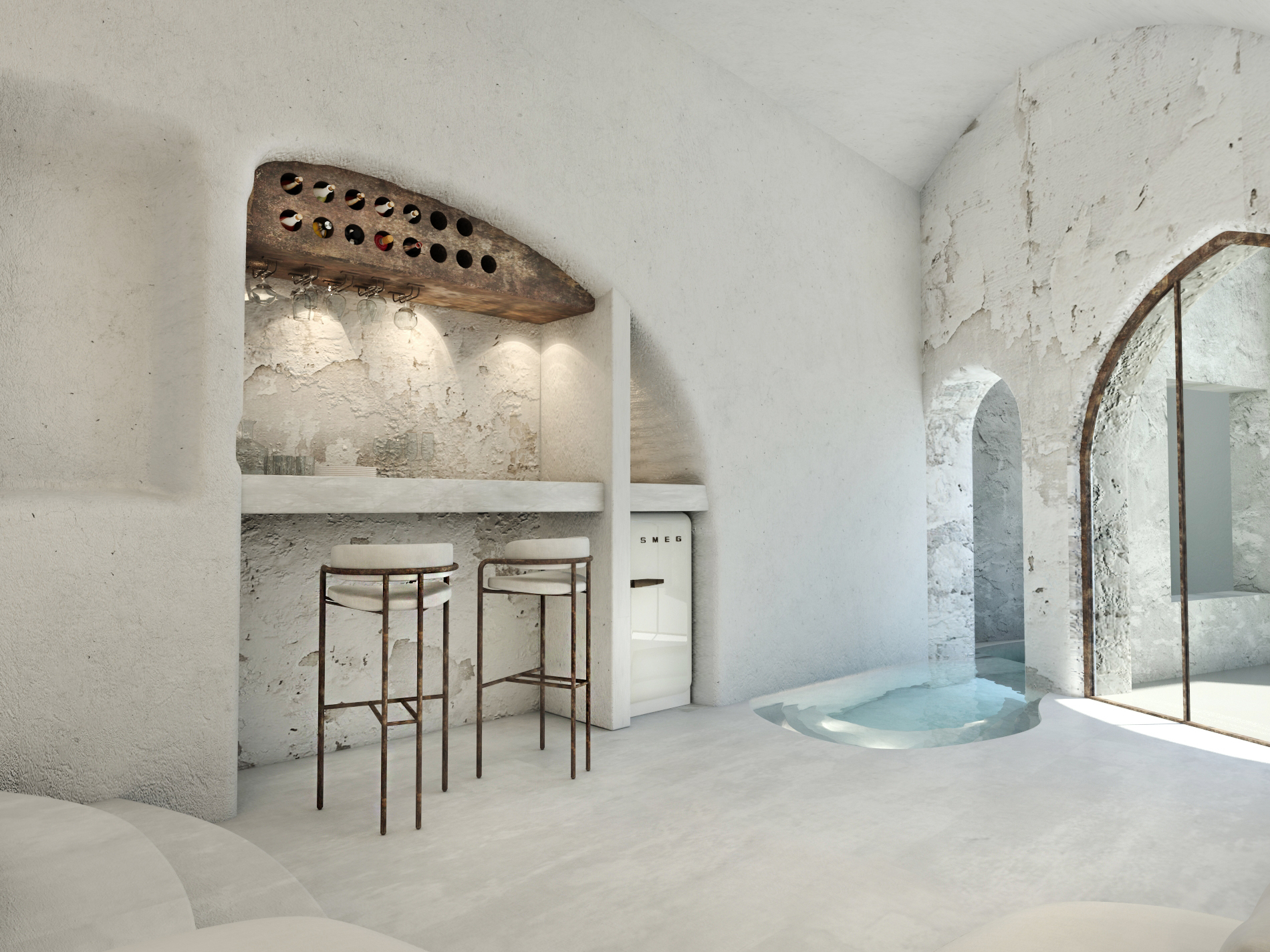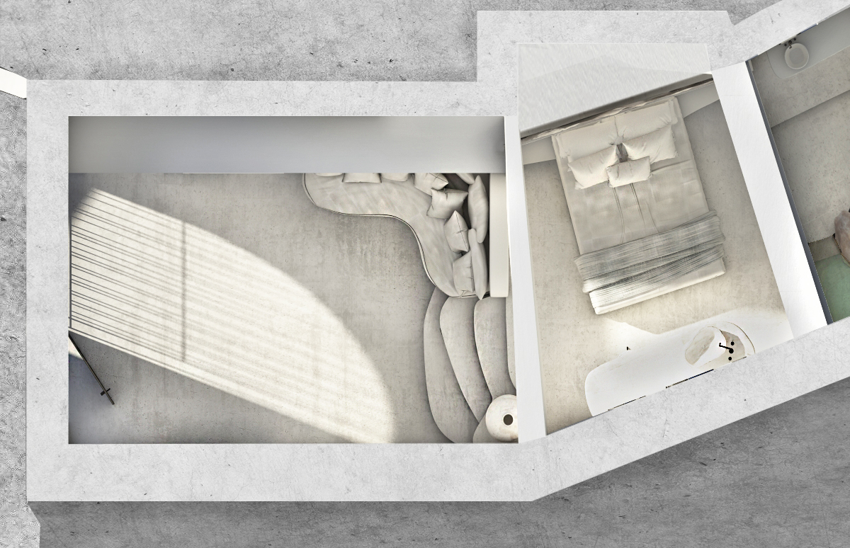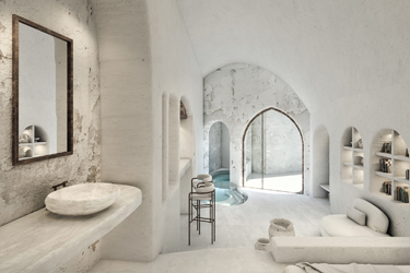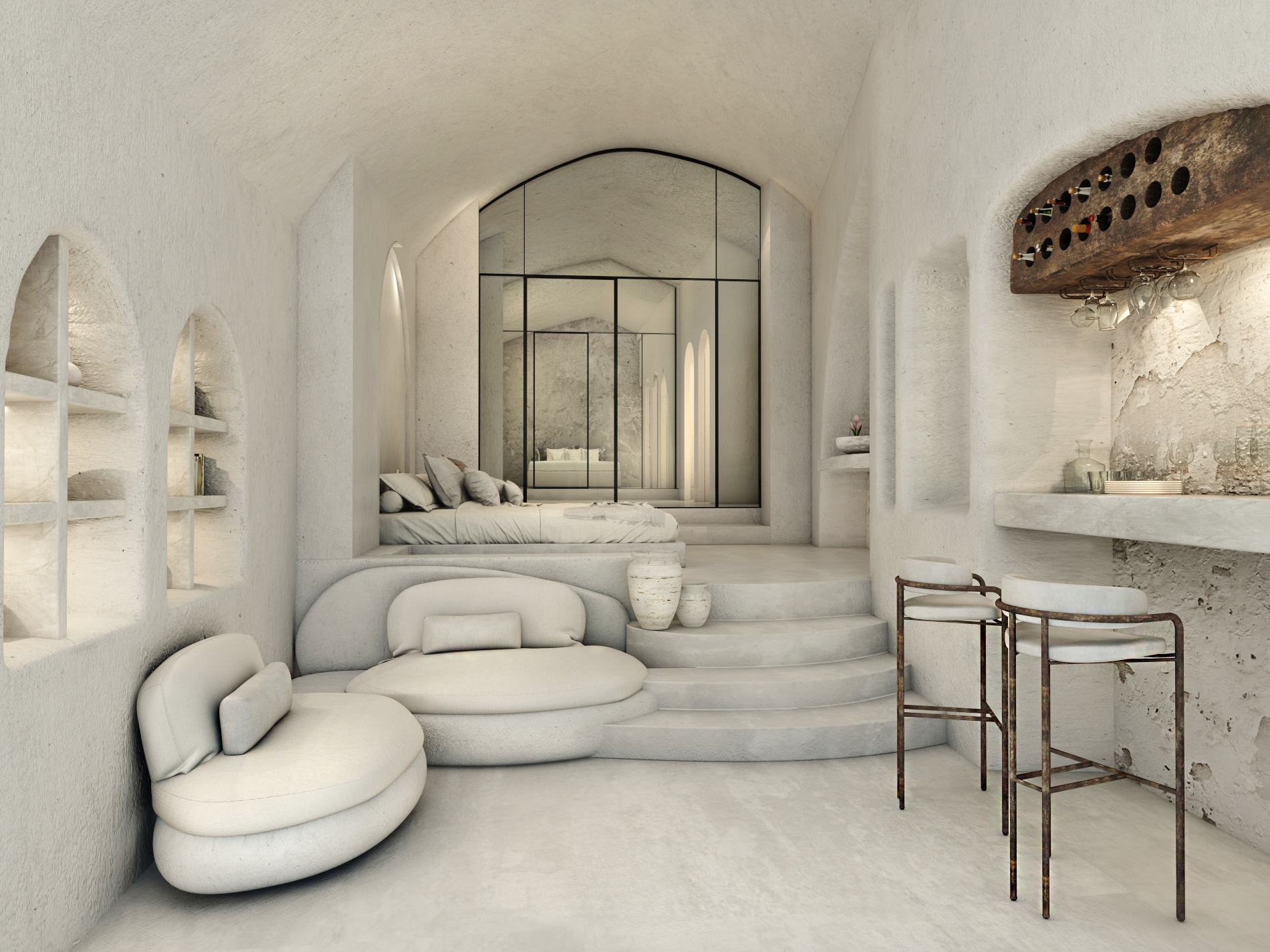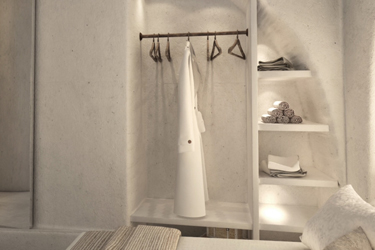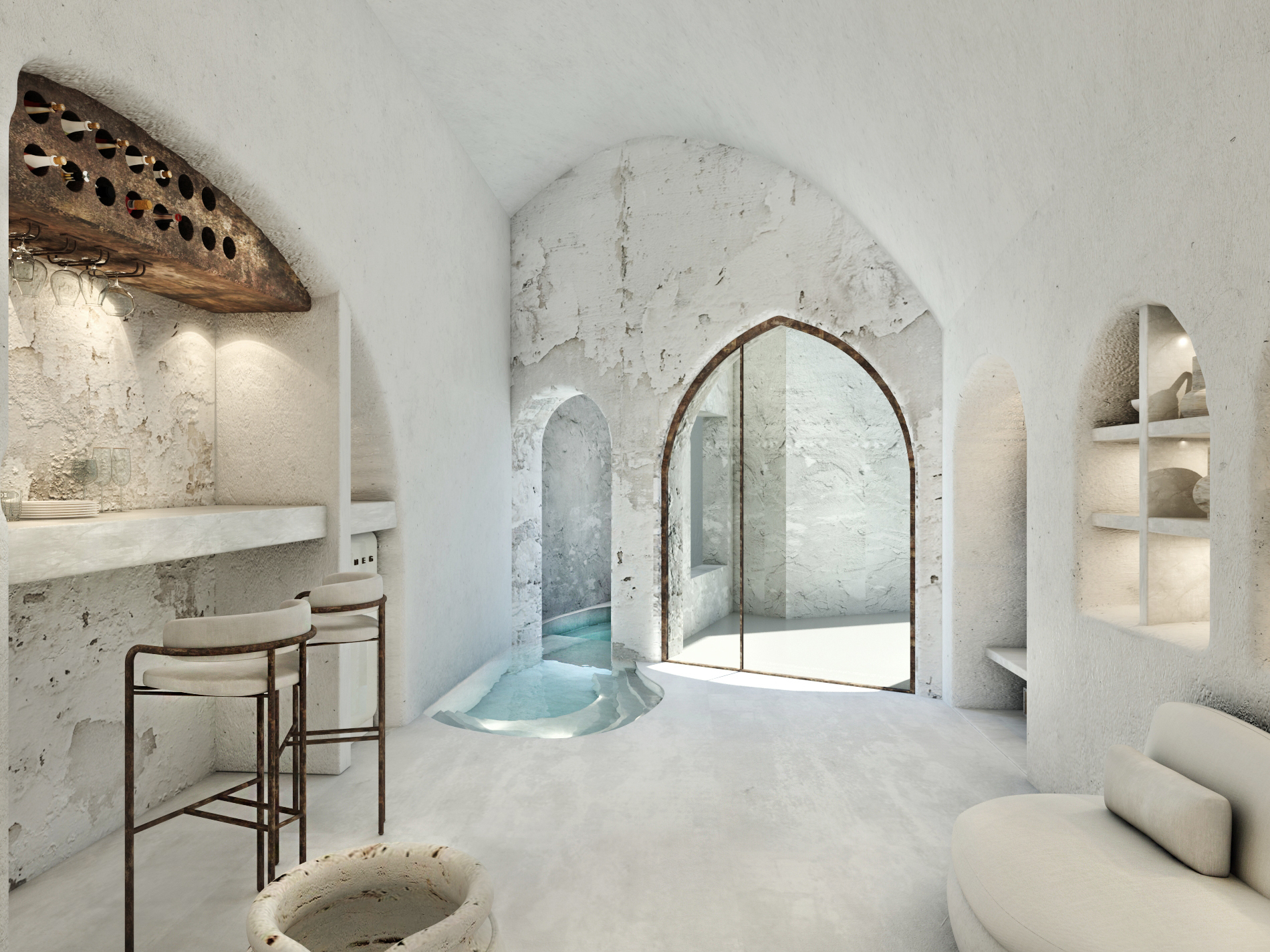 The guest opens the door of his suite and enters another world, a respite from ordinary life. Antiquity, though principal, transcends its era and becomes inextricably intertwined with a contemporary design, dramatic features and the art deco element that triumphs in this suite: Arches housing glass doors, the opulence of the coach, the rock above the bed as an organic texture of the suite. The jacuzzi pool with its many twists and turns that “hugs” the water, the light that is highlighted as the protagonist of an Impressionist painting, the aesthetics of tranquility that are periodically disturbed by the iron textures on the perimeter of the door leaf. The strict stylistic patterns in the alcoves of the room, and the simple, clear-cut geometry of the walls. The supremacy of the water adds a sense of exoticism that every paradise loves to evoke. A room and a word intricately linked to it, which enfolds what dreams do not say. One big word: “Aegean.”