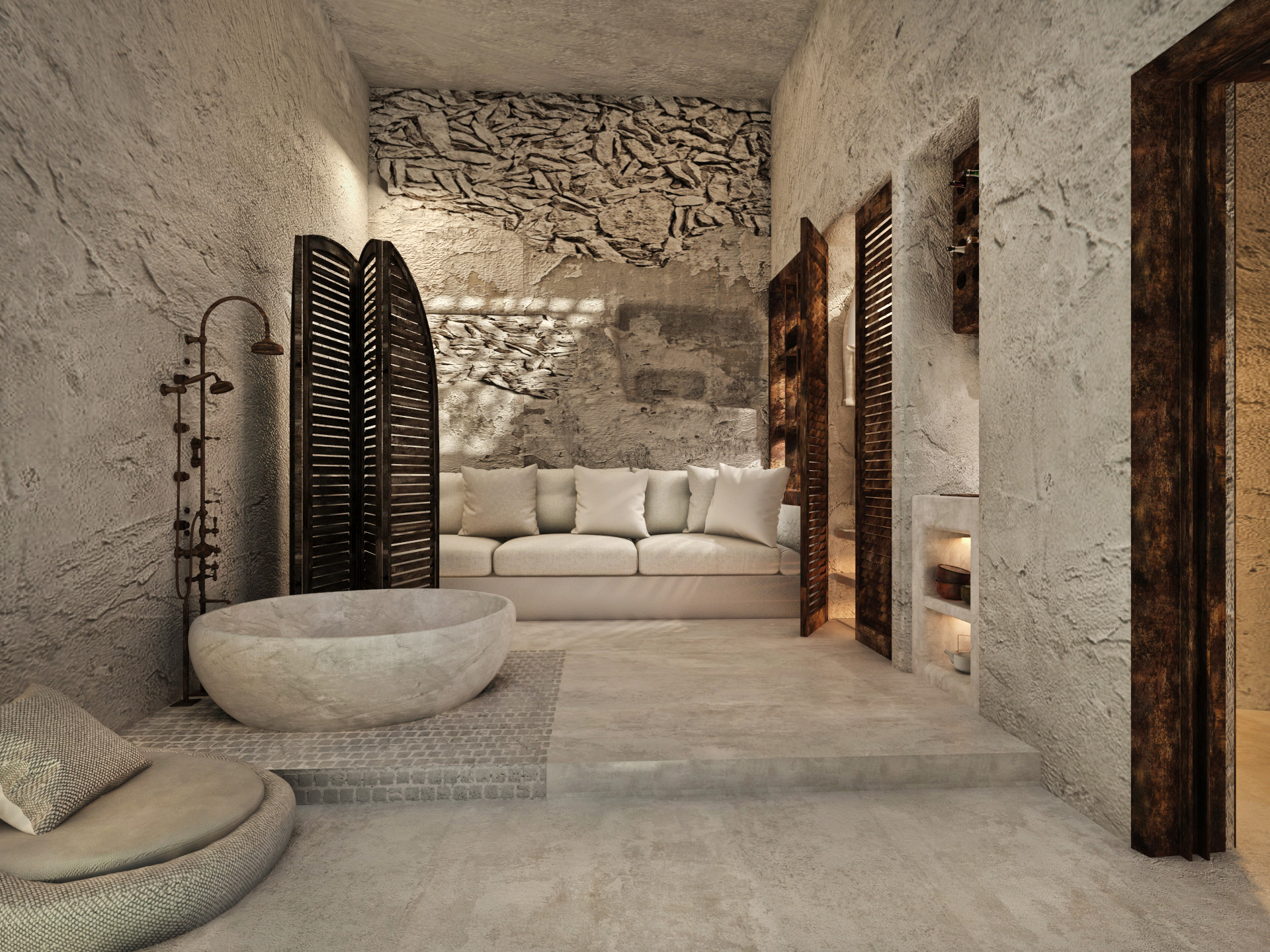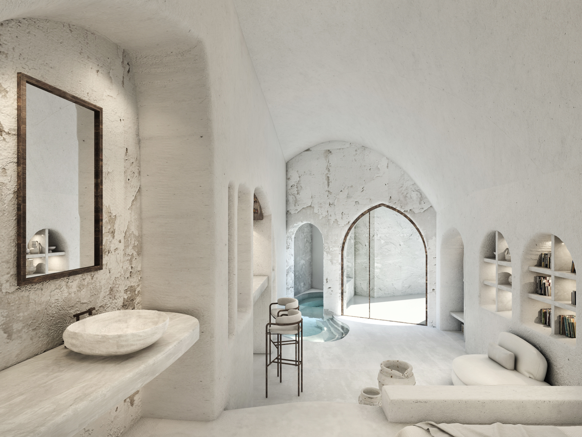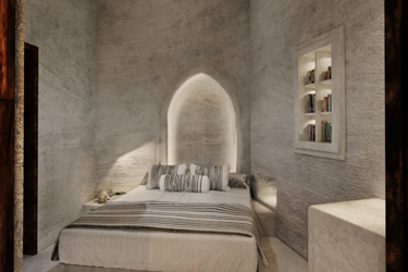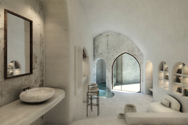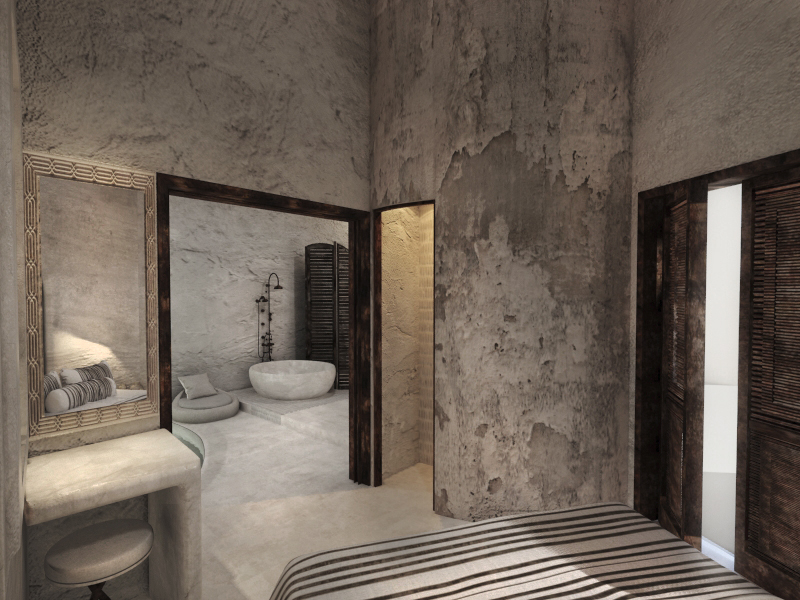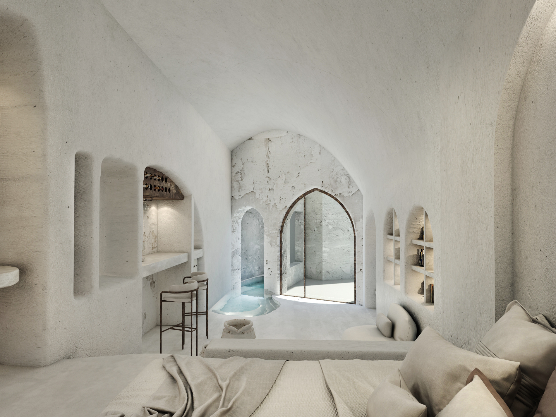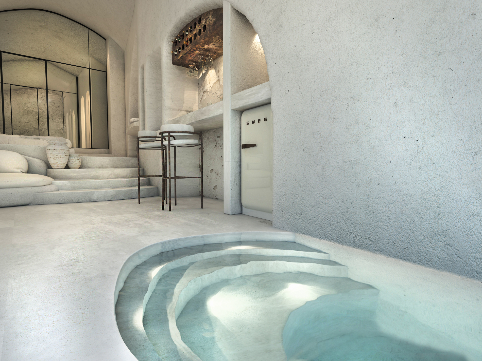 The guest opens the door of his suite and enters another world, a respite from ordinary life. Antiquity, though principal, transcends its era and becomes inextricably intertwined with a contemporary design, dramatic features and the art deco element that triumphs in this suite: Arches housing glass doors, the opulence of the coach, the rock above the bed as an organic texture of the suite. The jacuzzi pool with its many twists and turns that “hugs” the water, the light that is highlighted as the protagonist of an Impressionist painting, the aesthetics of tranquility that are periodically disturbed by the iron textures on the perimeter of the door leaf. The strict stylistic patterns in the alcoves of the room, and the simple, clear-cut geometry of the walls. The supremacy of the water adds a sense of exoticism that every paradise loves to evoke. A room and a word intricately linked to it, which enfolds what dreams do not say. One big word: “Aegean.”