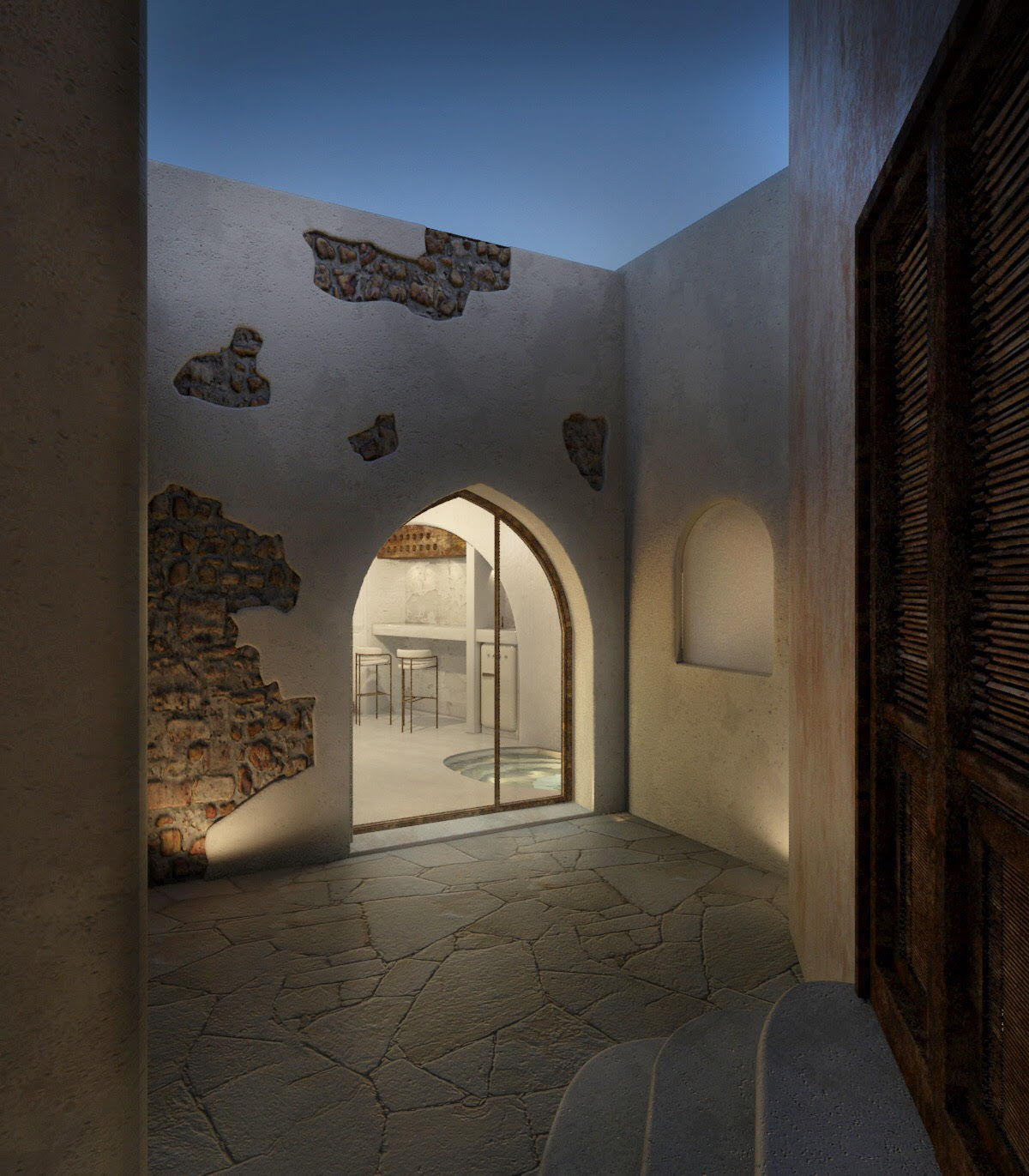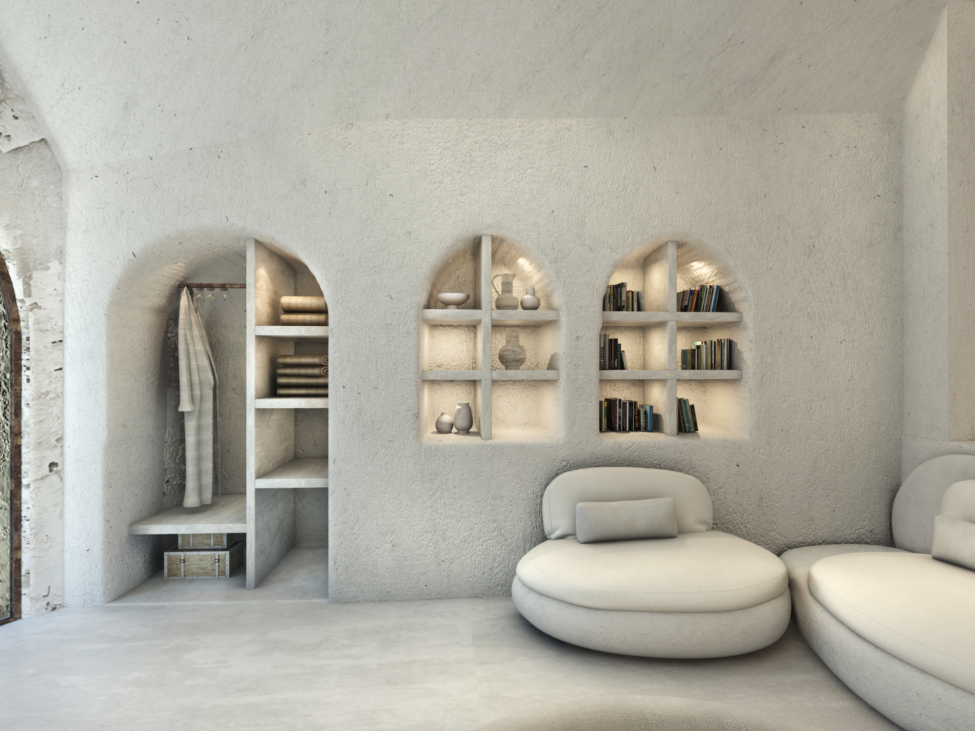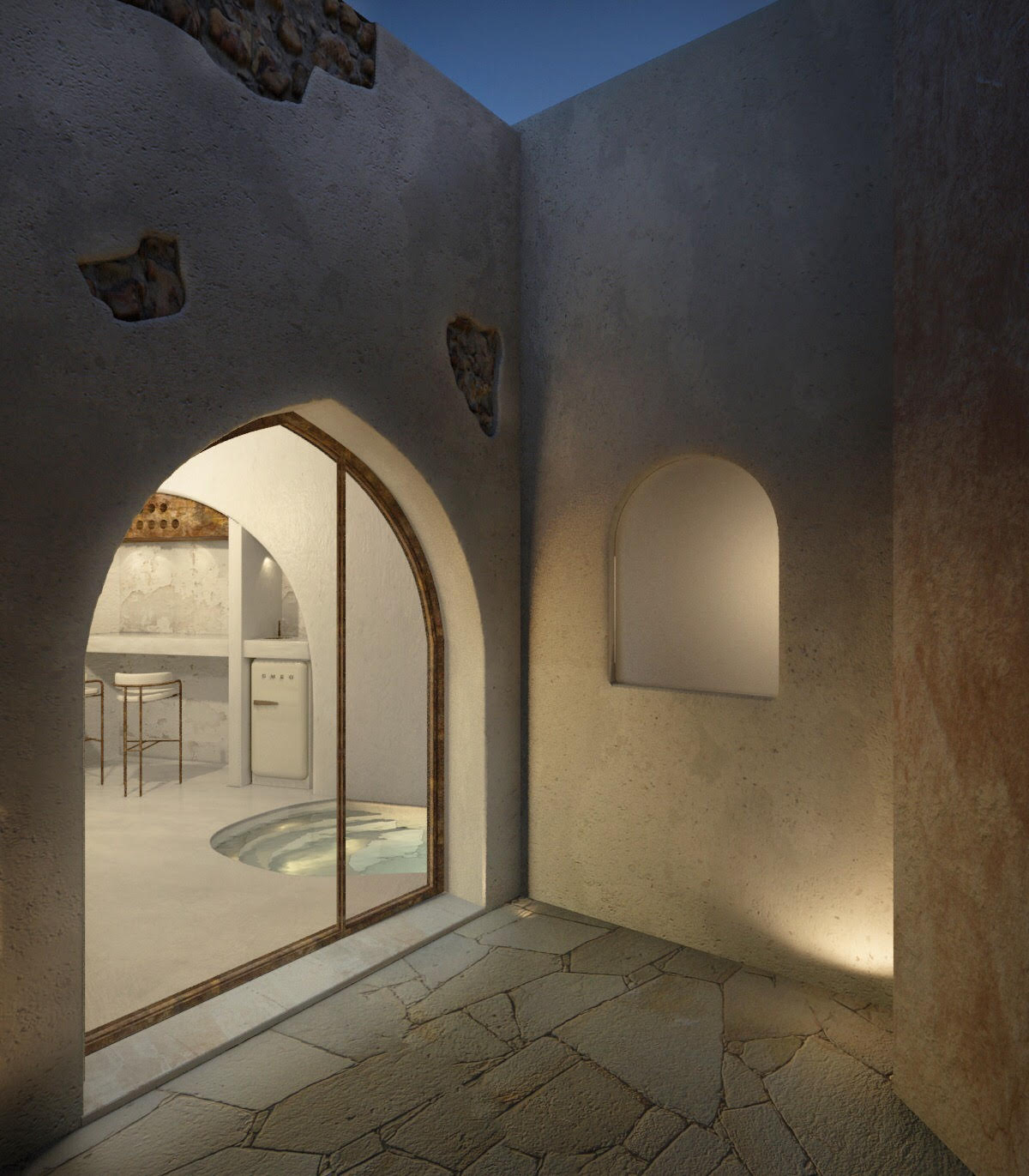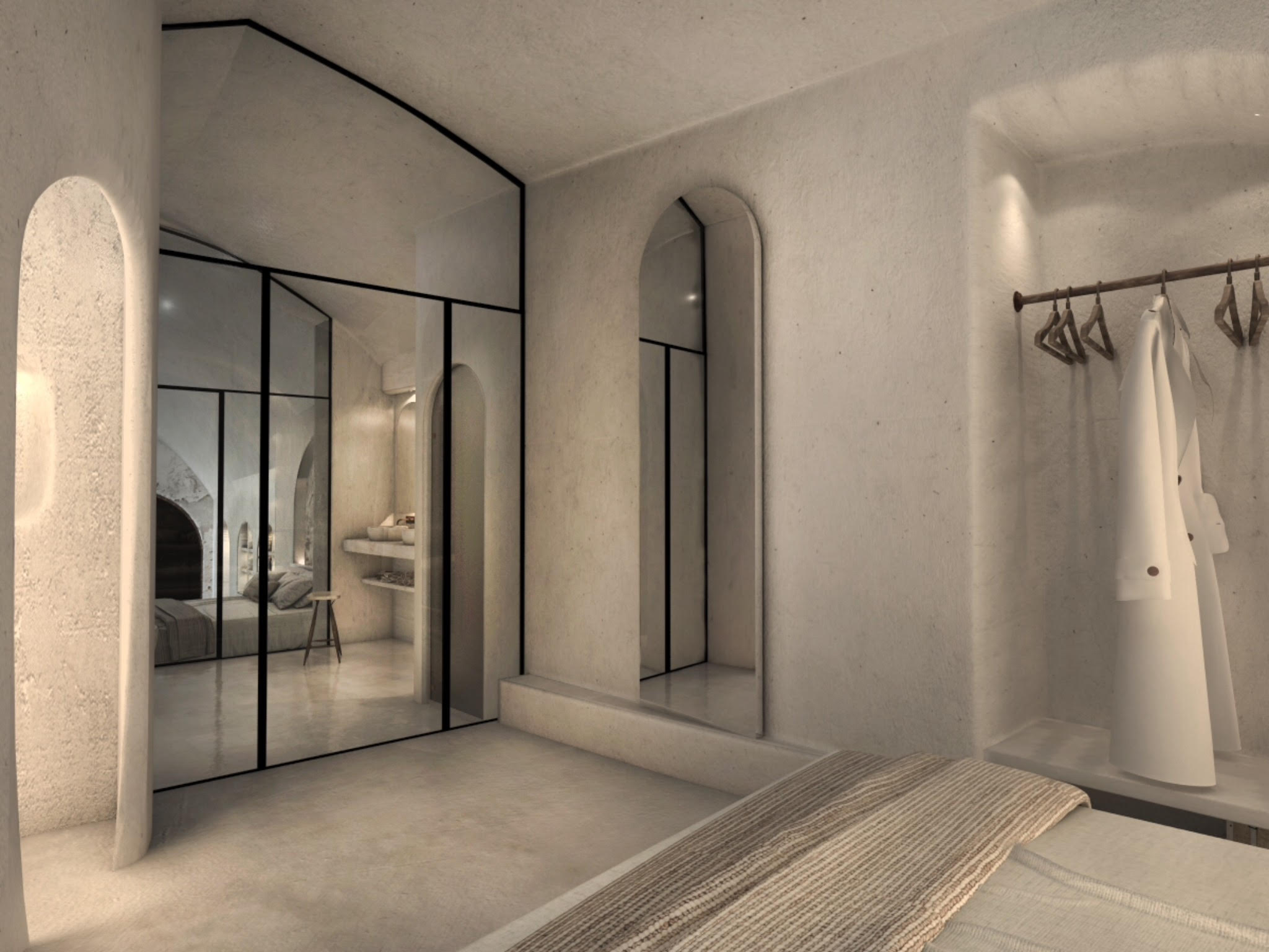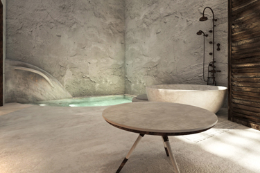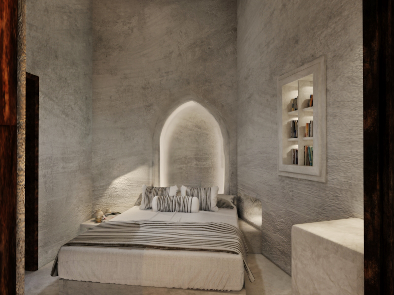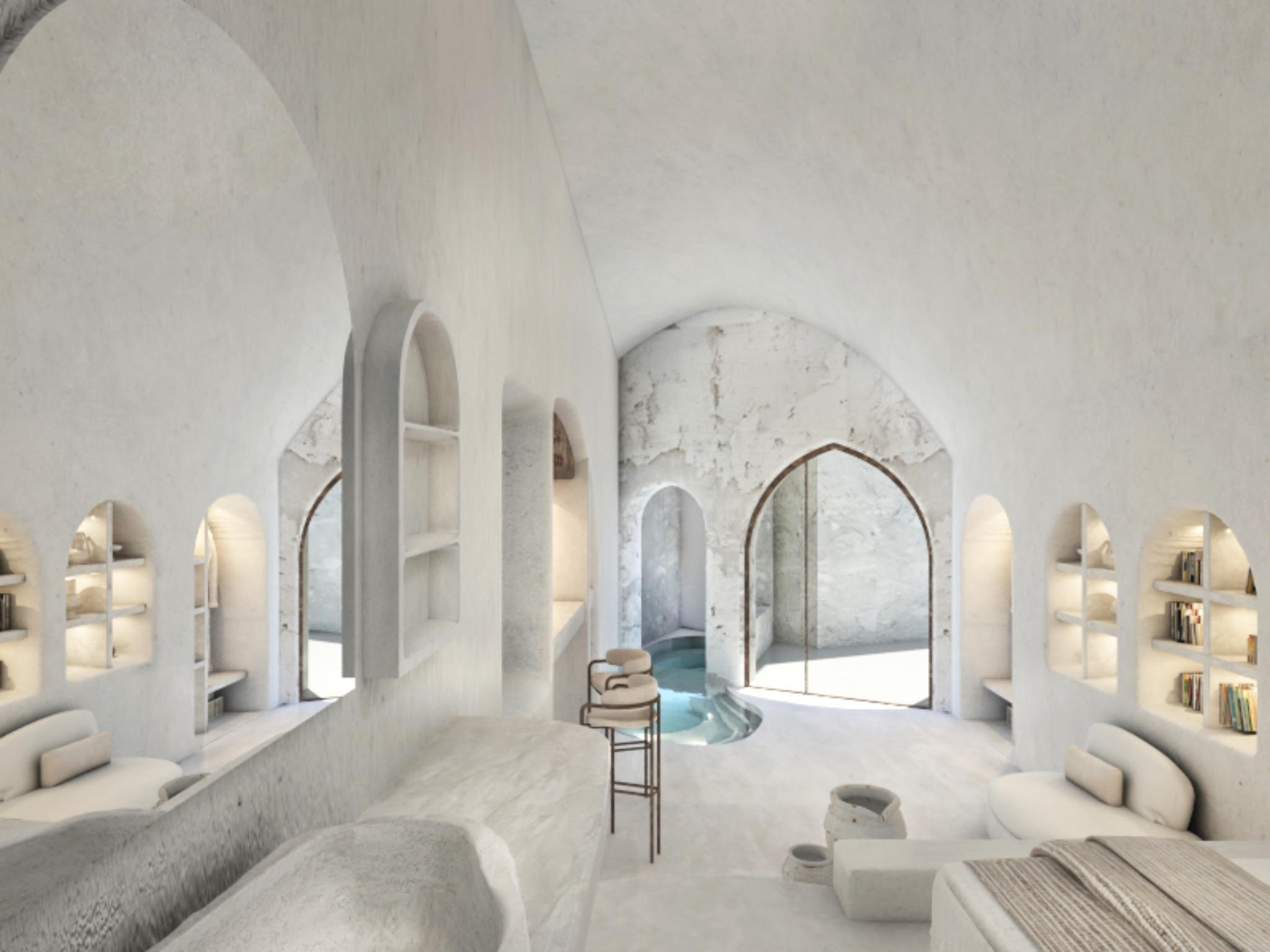 The guest opens the door of his suite and enters another world, a respite from ordinary life. Antiquity, though principal, transcends its era and becomes inextricably intertwined with a contemporary design, dramatic features and the art deco element that triumphs in this suite: Arches housing glass doors, the opulence of the coach, the rock above the bed as an organic texture of the suite. The jacuzzi pool with its many twists and turns that “hugs” the water, the light that is highlighted as the protagonist of an Impressionist painting, the aesthetics of tranquility that are periodically disturbed by the iron textures on the perimeter of the door leaf. The strict stylistic patterns in the alcoves of the room, and the simple, clear-cut geometry of the walls. The supremacy of the water adds a sense of exoticism that every paradise loves to evoke. A room and a word intricately linked to it, which enfolds what dreams do not say. One big word: “Aegean.”
