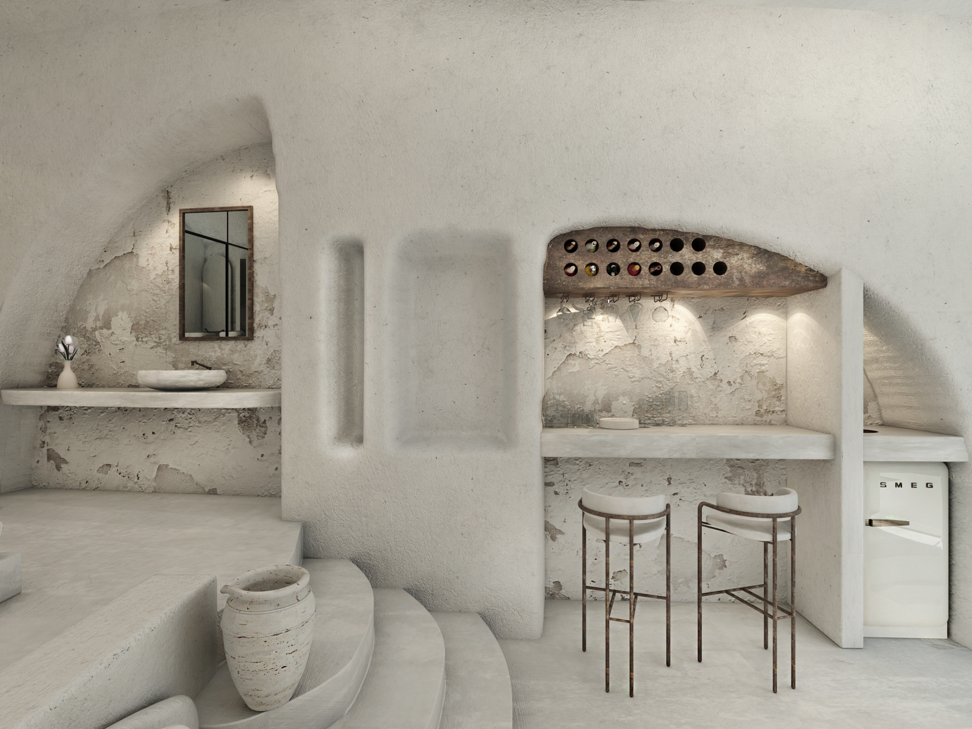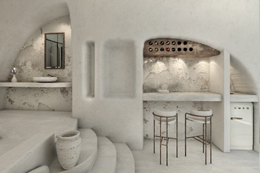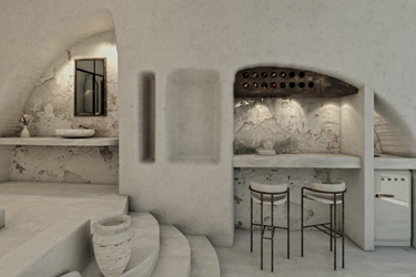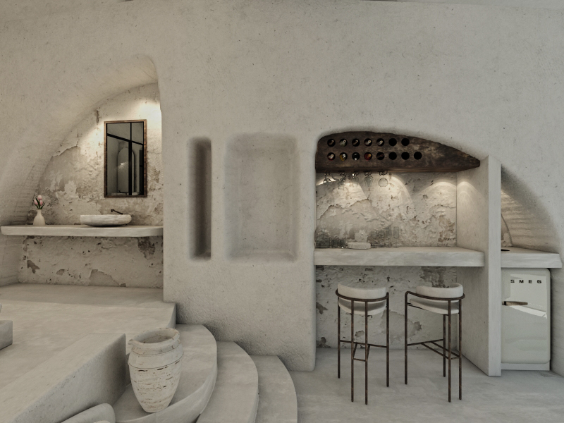 This canava with the multiple chambers will keep you cool in summer and warm in winter owing to the stable temperature that each canava has to uphold for the refined and graceful aging of wine. The dominant white calming shades on the walls and the furniture harmoniously coexist with warm colors, colors identical to the Santorini sky and the show that it gives every sunset. Colors reminiscent of an amalgamation of the theraic earth and the volcanic ash that covered Akrotiri in 1613 B.C. These already striking features accented with the black stone, the volcanic material with which this canava was built one hundred and fifty years ago, make a definite promise to accommodate you in everything that have always mattered: in feelings that are born, in serene places, in places with pure-hearted people, in places steeped in history. If paradise exists, it has to look like this.