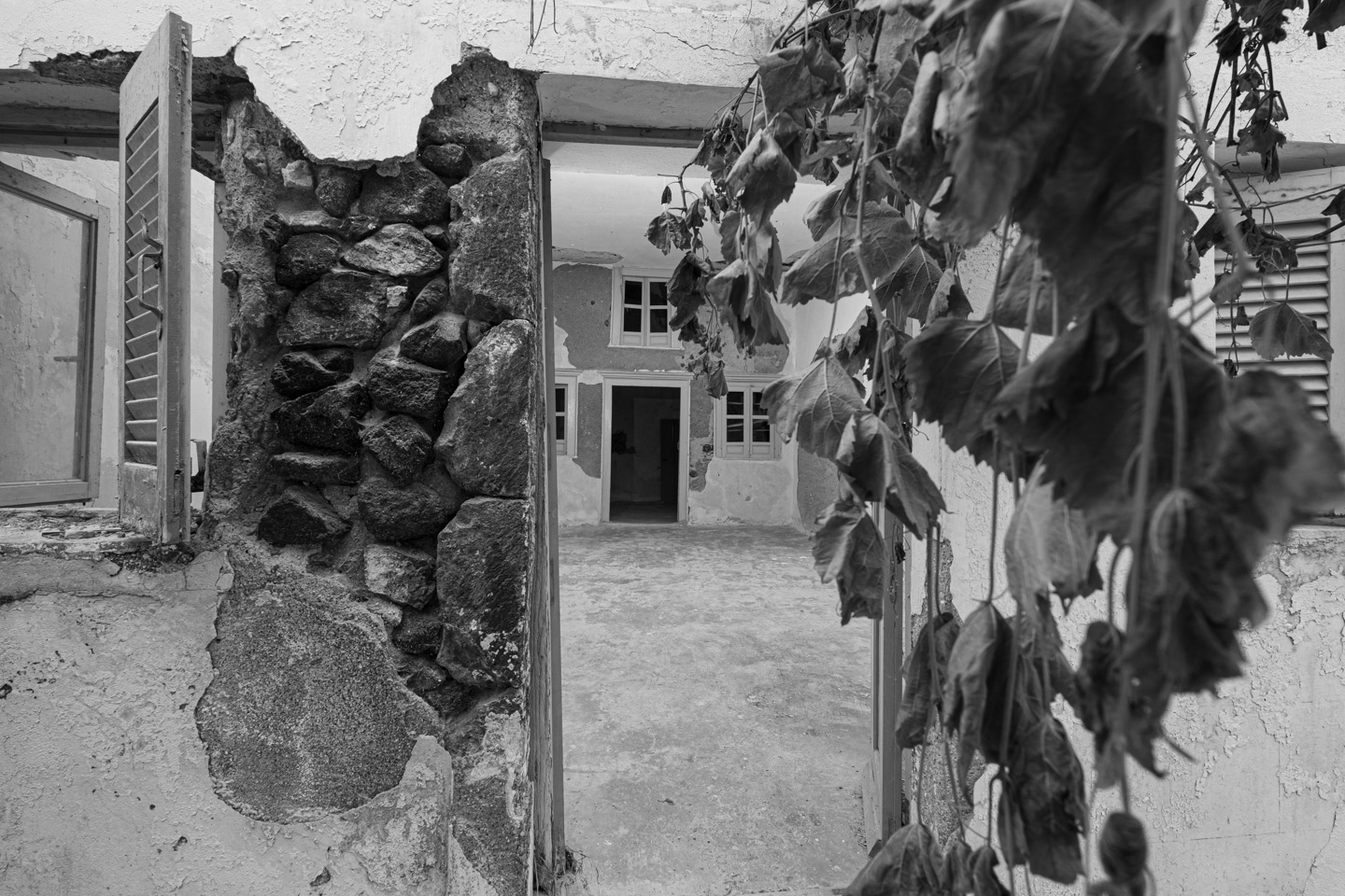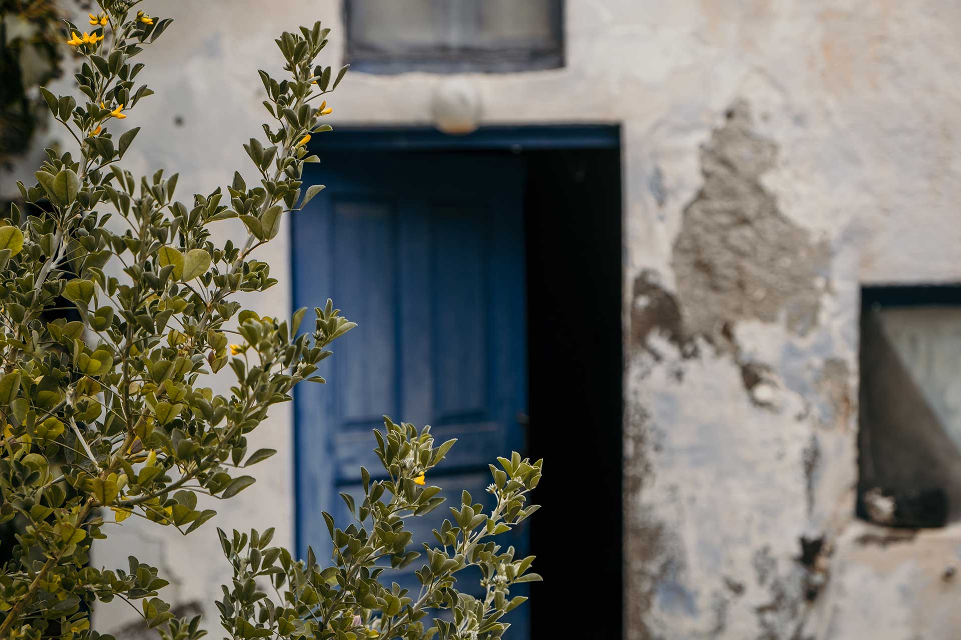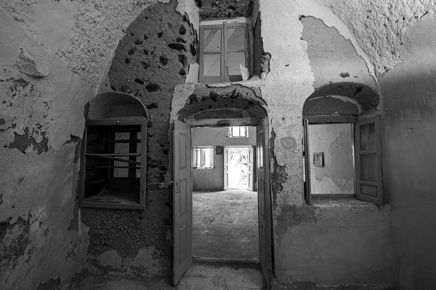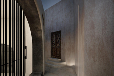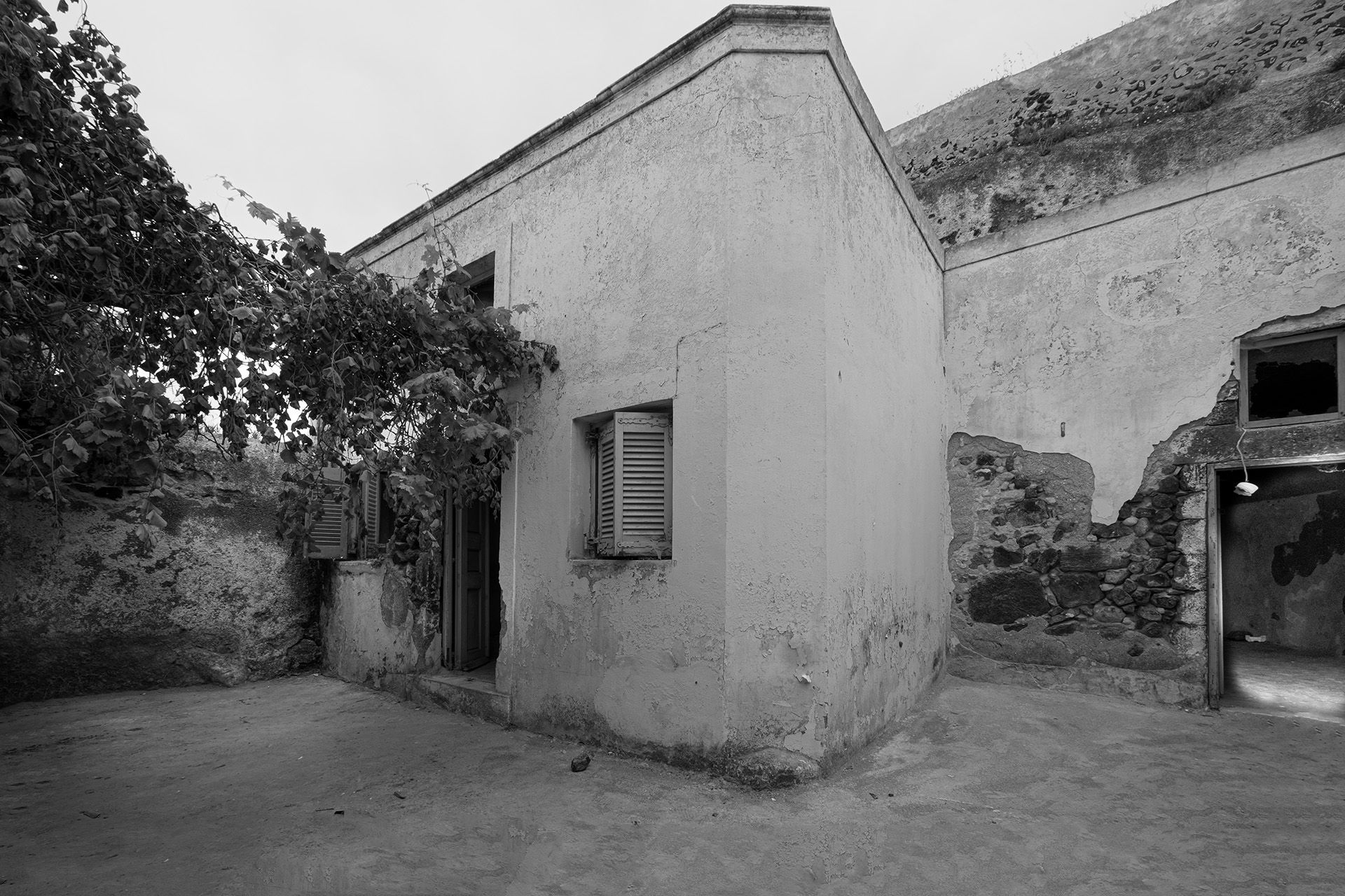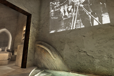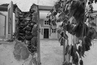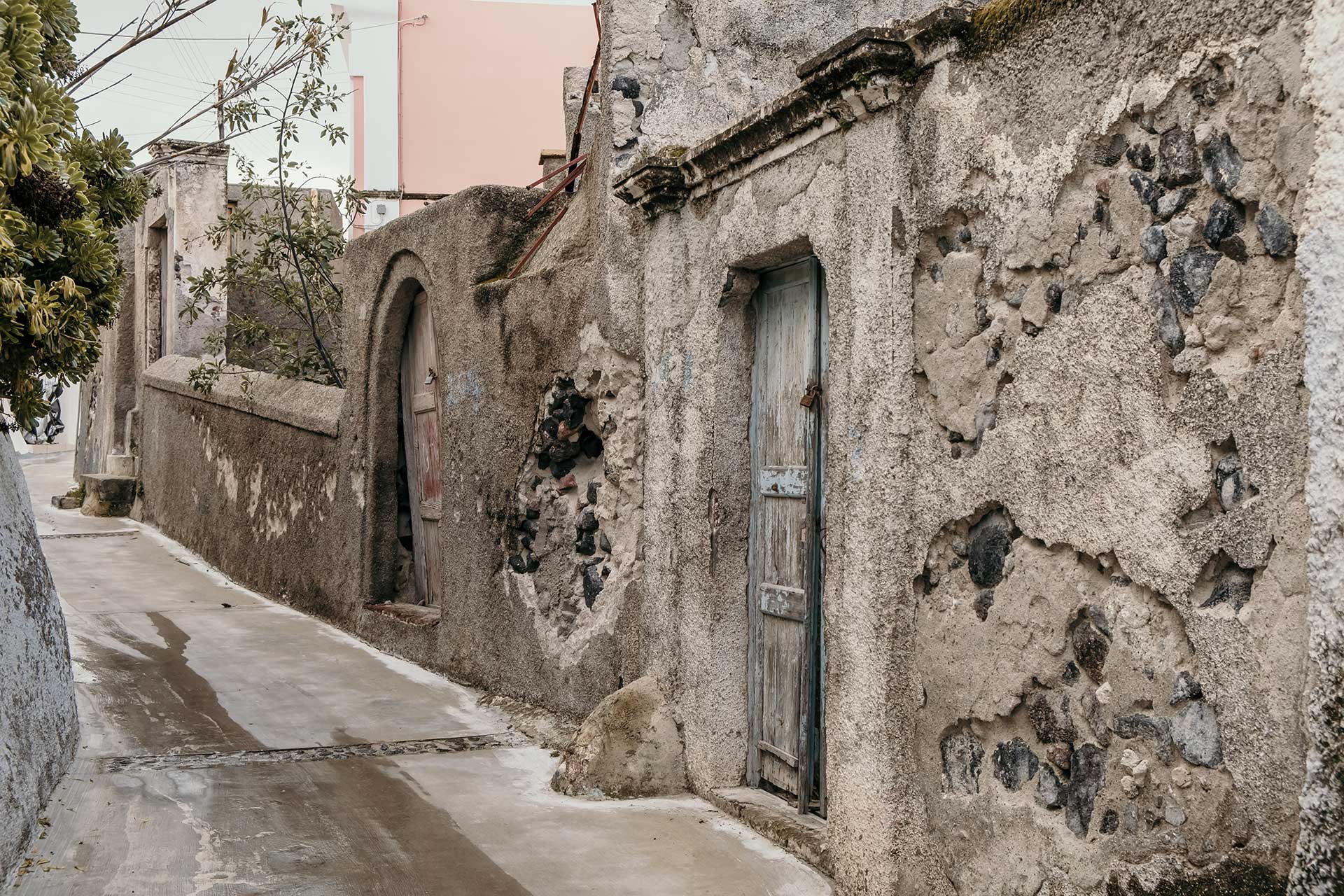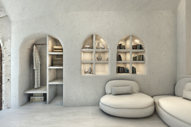 1956, the island's powerful earthquake rocks the house and the family receives grant money from the state for restoration and the creation of an additional, new home adjacent to the cave house. The rebuilding process commences in 1964 when all the family members, from the father to the youngest grandchild, go to the beaches of Santorini. There, they collect tiny sea pebbles and remodel with them the former sheepfold into a home, maintaining the small space for the animals in the caves and putting them in at night. This material, the pebbles of the sea, in combination with the theraic earth and the porcelain, provides the home with static strength and geometric stability. It is the same building material, the same soil, with which the Suez Canal was built.